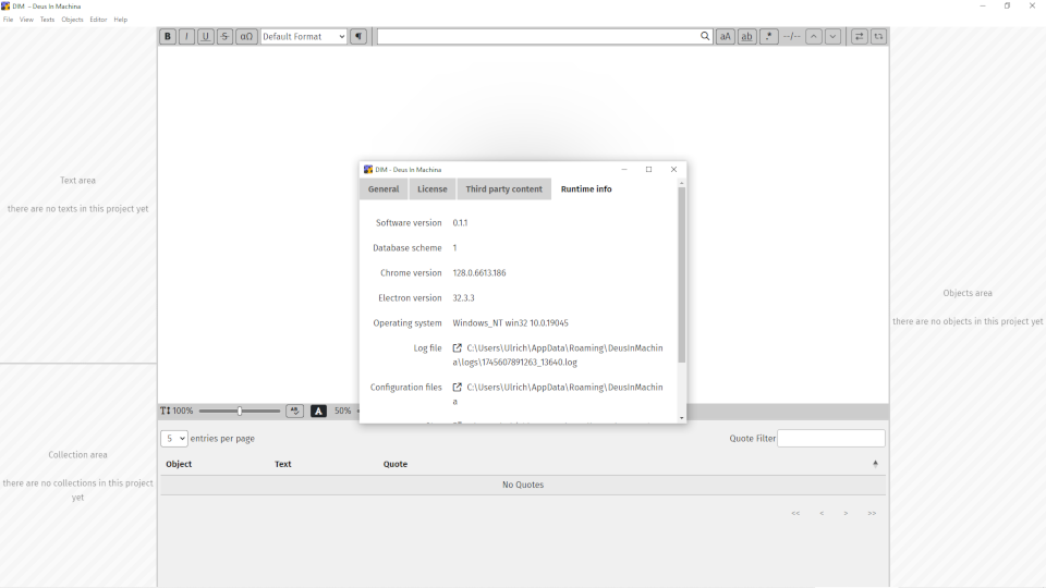 In case of error reporting please provide the logfile that is linked in the tab Runtime Info of the About Window (to open use menu item Help → About DIM). If possible, activate the setting start in Debug Mode first which makes logging much more detailed.