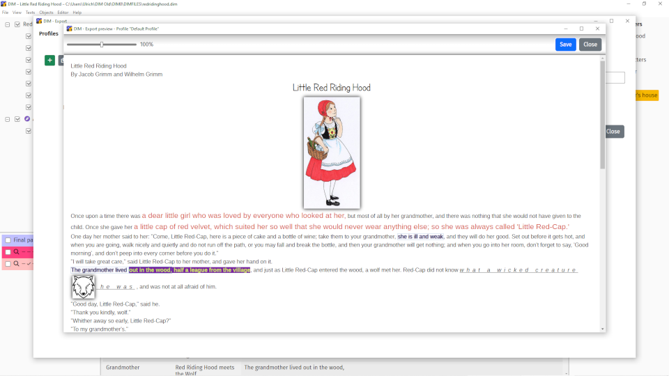 Thus, only when exporting you decide what becomes part of your product -- which texts, which objects and what metadata. Don't expect fancy formatting such as page numbers or footnotes. Your standard word processor or desktop publishing program is a good place to feed the export into to give it the final polish.