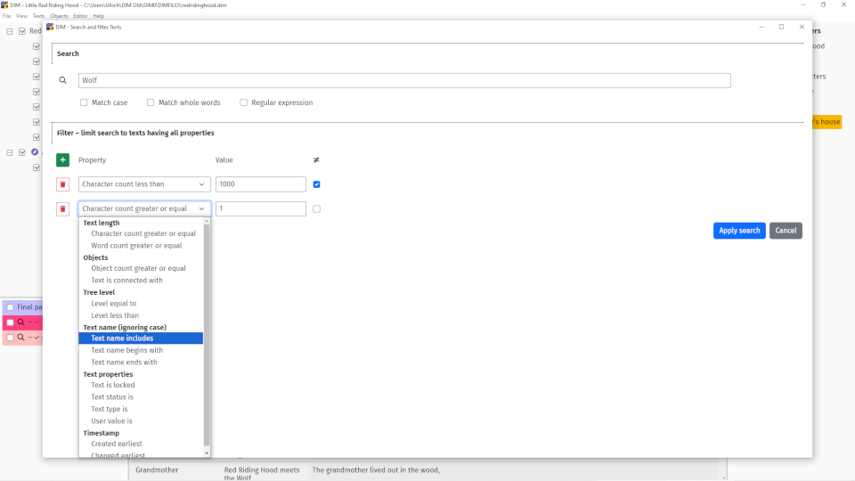Use menu item Texts → Search and filter to open a new window where you can