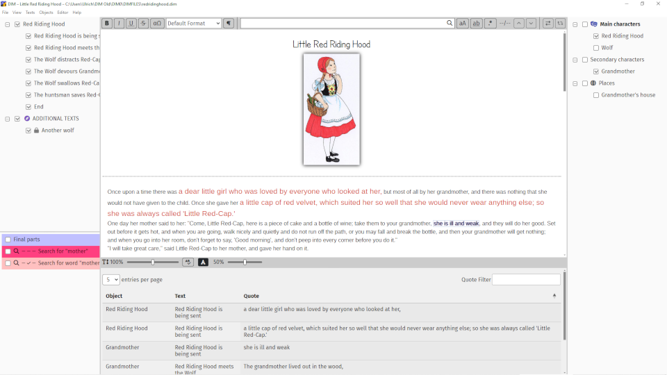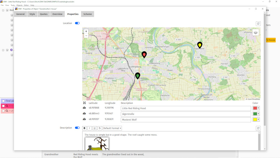 The real magic happens when you connect both levels, syntactic (text) and semantic (world). You can tag any text passage with any world item (called object), resulting in a list of quotes that are connected to that item. When you edit one of these text passages the respective quote is updated automatically. In the text editor you can easily inspect what objects are connected to a text. Just activate the objects you are interested in and they get highlighted by their fully customizable individual style.