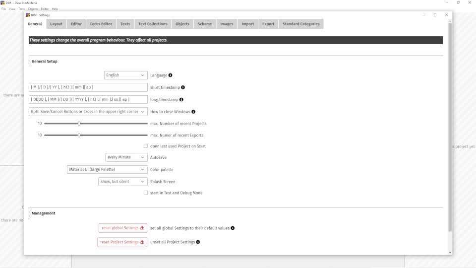 Project settings are specific to individual projects, overruling the respective global settings. They are stored within project files.